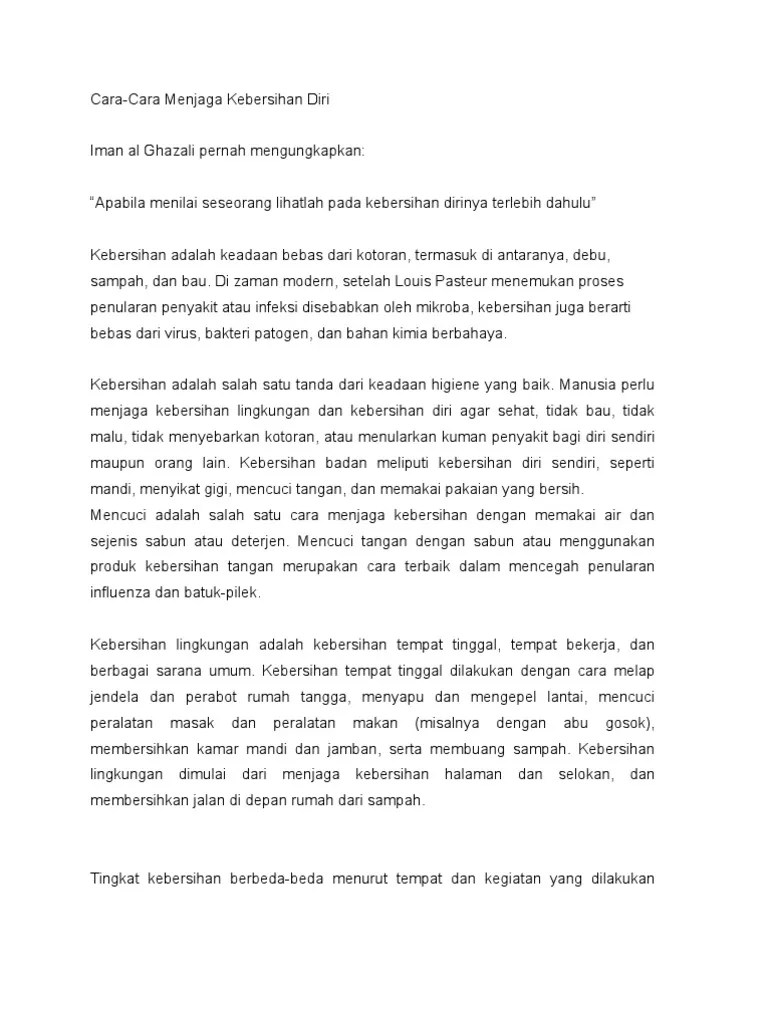 Jika kita menjaga kebersihan diri, . Menjaga kebersihan dalam semua aspek amatlah . Berikut adalah contoh karangan kepentingan menjaga kesihatan dan kebersihan diri untuk panduan pelajar.